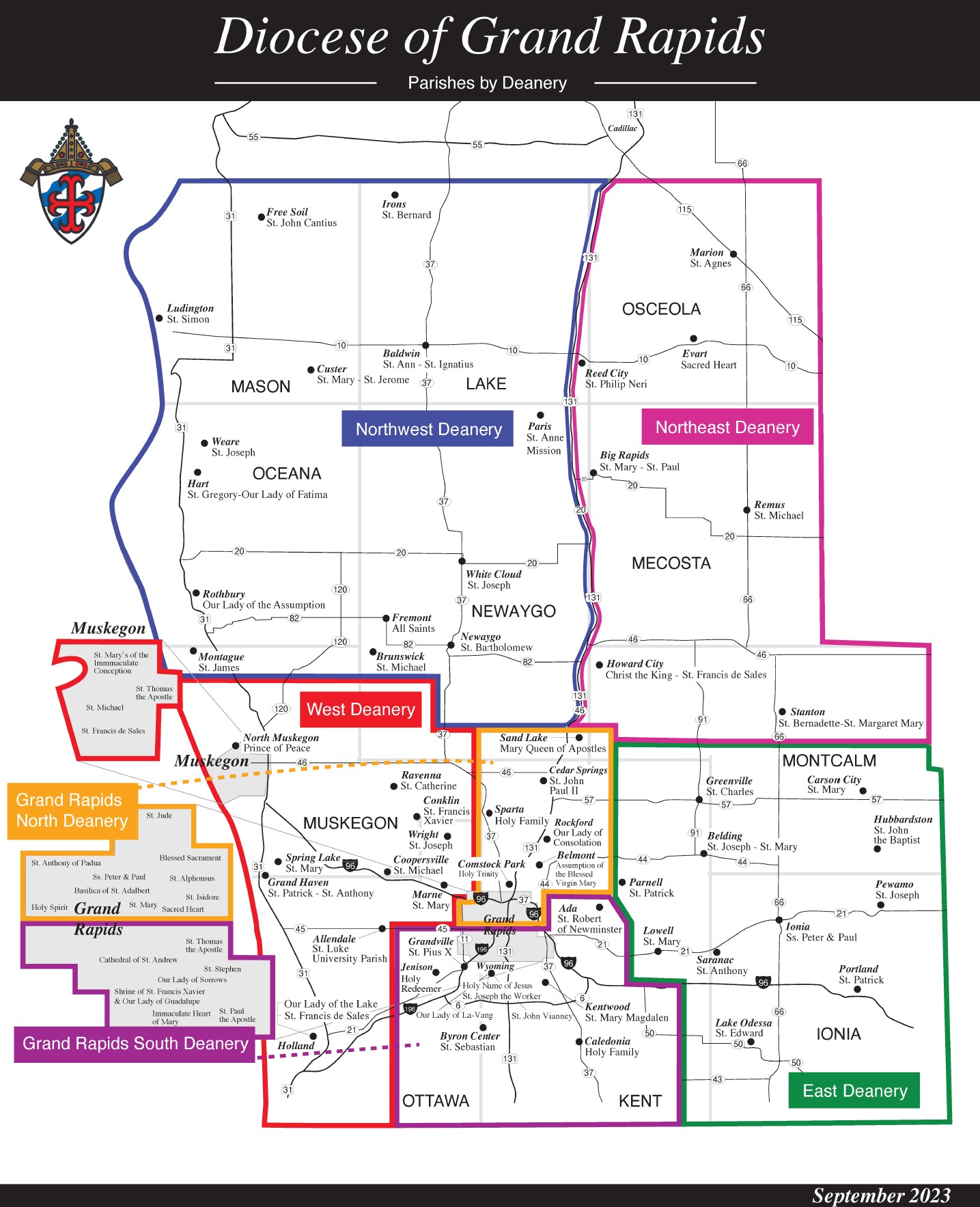 The Diocese of Grand Rapids is one of seven dioceses in the State of Michigan. The other six include the Archdiocese of Detroit, and the dioceses of Gaylord, Kalamazoo, Lansing, Marquette, and Saginaw.
