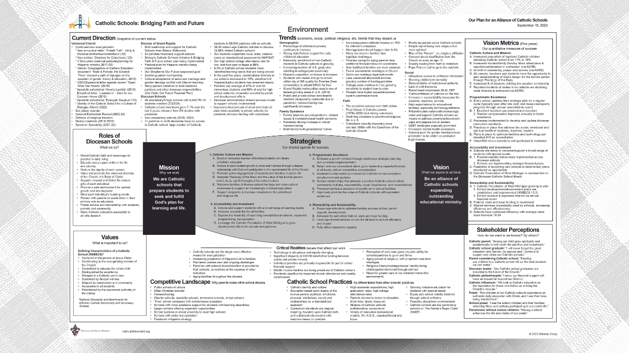 The Flipbook available at this link describes how the plan was developed through the "Bishop's Catholic Schools Initiative". Printed copies of this summary, and tri-fold pamphlets about the plan, are available from the Office of Catholic Schools.